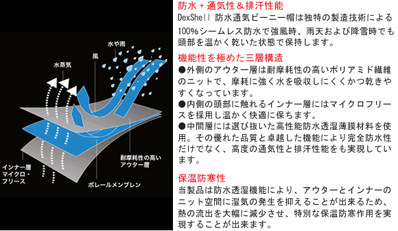 フリーサイズ グレー 防水通気 ビーニー帽 世界標準最先端素材 ●防水+通気性&排汗性能 DexShell防水保温靴下は独特の製造技術による 100%シームレス防水で透湿・排汗性が高く 強風時、雨天および降雪時でも 頭部を温かく乾いた状態で保持します。