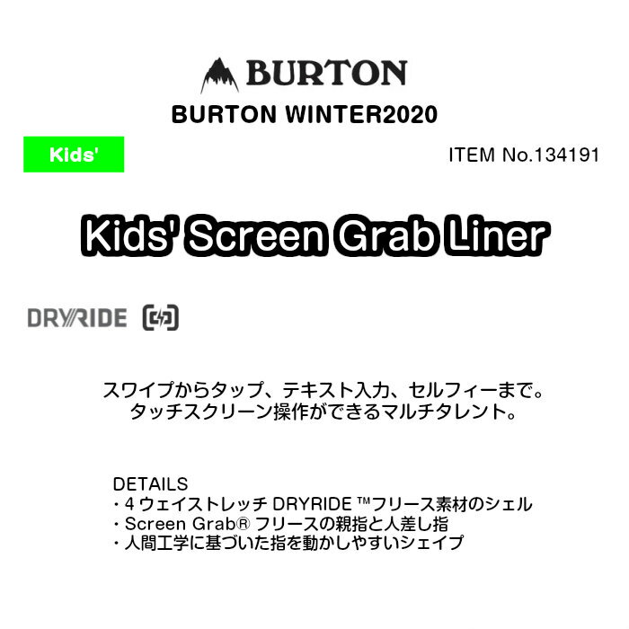 メーカー希望小売価格はメーカーカタログに基づいて掲載しています商品説明モデル名BURTONKids' Screen Grab Liner定価:2400+(税)サイズS , M , LカラーClassicBlue , Fuchsia概要KEY FEATURE・スワイプからタップ、テキスト入力、セルフィーまで。