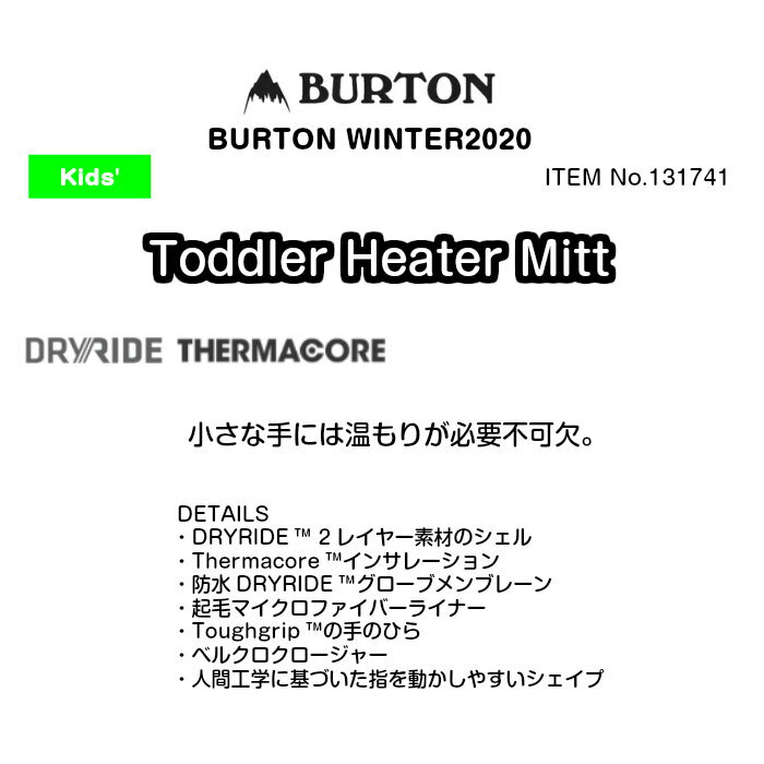 メーカー希望小売価格はメーカーカタログに基づいて掲載しています商品説明モデル名BURTONToddler Heater Mitt定価:3800+(税)サイズ2T , 4T , 6TカラーHideandSeek , TrueBlack , HoosThere概要KEY FEATURE・小さな手には温もりが必要不可欠。