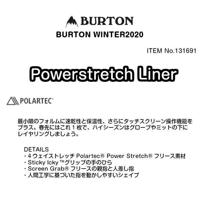 メーカー希望小売価格はメーカーカタログに基づいて掲載しています商品説明モデル名BURTONPowerstretch Liner定価:3600+(税)サイズS/M , M/L , L/XLカラーFaded , TrueBlack , MoodIndigo , Keef概要KEY FEATURE・最小限のフォルムに速乾性と保温性、さらにタッチスクリーン操作機能をプラス。